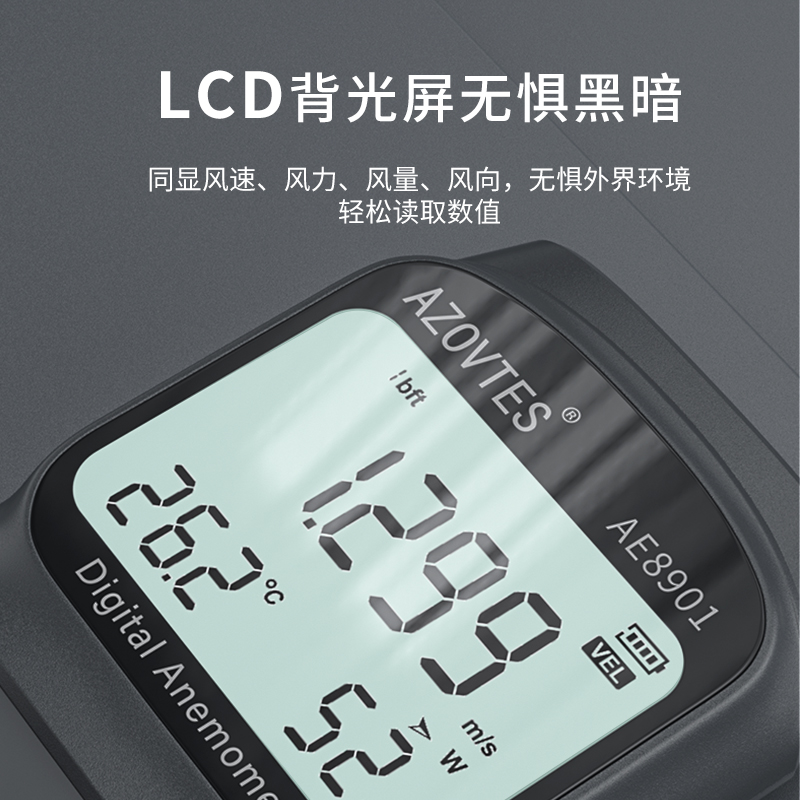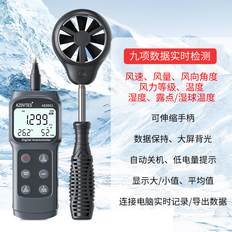 AE8901是一款多功能九合一分體風速儀,具有風速,風量,風溫,風向角度,風速等級,露點/濕球溫度,999筆數據存儲,可連接電腦傳輸等優(yōu)點。標配可伸縮外接探頭方便測量??蓮V泛應用于電力、海上作業(yè)、風扇制造業(yè)、石化、節(jié)能、戶外等諸多領域。
